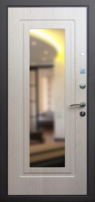 Эта модель создана для тех, кто ценит не только прочность, но и практичность в повседневном использовании. Стальной каркас из профильной трубы и лист металла толщиной 2 мм с рёбрами жёсткости формируют надёжную основу, способную выдерживать серьёзные нагрузки. Снаружи дверь защищена порошковым покрытием, которое устойчиво к влаге, солнцу и механическим повреждениям, а изнутри отделана МДФ-накладкой, придающей интерьеру уют и аккуратность. В центре конструкции внимание привлекает зеркало — удобная деталь, которая избавляет от необходимости в дополнительном настенном аксессуаре и одновременно делает пространство визуально просторнее. Именно здесь название модели — металлическая дверь с зеркалом в дом №2 — обретает своё значение, сочетая функциональность с эстетикой. Для повышения безопасности предусмотрены два замка российского производства с независимыми системами запирания, а также блокираторы. Два контура уплотнителя защищают от сквозняков и пыли, а возможность выбрать направление открывания делает установку универсальной. Металлическая дверь с зеркалом в дом №2 от производителя: быстрое изготовление и монтаж в Дмитрове, индивидуальные размеры, широкий выбор материалов и фурнитуры, официальная гарантия до 10 лет.