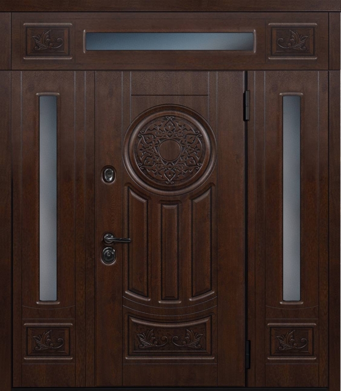 Эта нестандартная парадная дверь с фрамугой №6 — отличный выбор для тех, кто ценит элегантность и долговечность. Внешняя и внутренняя отделка из МДФ придает дверям стильный и современный вид, а также защиту от механических повреждений. МДФ устойчива к царапинам и вмятинам, что делает дверь идеальной для долгосрочной эксплуатации. Каркас из профильной трубы 50х25 мм и лист металла толщиной 2 мм обеспечивают прочность и надежность, а ребра жесткости из профильных труб гарантируют дополнительную устойчивость. В двери установлены блокираторы, два контура уплотнителей из резины, что повышает звуко- и теплоизоляцию. Замки от известных производителей, таких как Просам и Мосрентген, обеспечат надежную защиту. Возможность комбинировать отделку, добавлять зеркало, стеклопакет или кованые элементы позволяет легко адаптировать дверь под любые предпочтения. Нестандартная парадная дверь с фрамугой №6 от производителя: быстрое изготовление и монтаж в Дмитрове, индивидуальные размеры, широкий выбор материалов и фурнитуры, официальная гарантия до 10 лет.