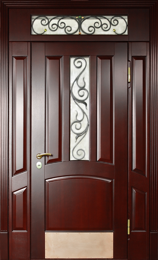 Красивая шпонированная дверь с надежной фурнитурой и ковкой "лоза" №33 идеально дополнит интерьер вашего частного дома или коттеджа. Внешняя и внутренняя отделка выполнены из натурального дерева, что придает двери элегантность и стиль. Профильная труба 50х25 мм используется для каркаса и полотна, а лист металла толщиной 2 мм и ребра жесткости из профильных труб 40х25 мм обеспечивают прочность и долговечность. Несмотря на отсутствие терморазрыва, дверь гарантирует надежную защиту и теплоизоляцию благодаря двум контурам уплотнения. Элементы ковки "лоза" придают двери особое очарование, сочетая практичность с эстетикой. Эта дверь — идеальный выбор для тех, кто ценит стиль, качество и безопасность. Красивая шпонированная дверь с надежной фурнитурой и ковкой "лоза" №33 от производителя: быстрое изготовление и монтаж в Дмитрове, индивидуальные размеры, широкий выбор материалов и фурнитуры, официальная гарантия до 10 лет.